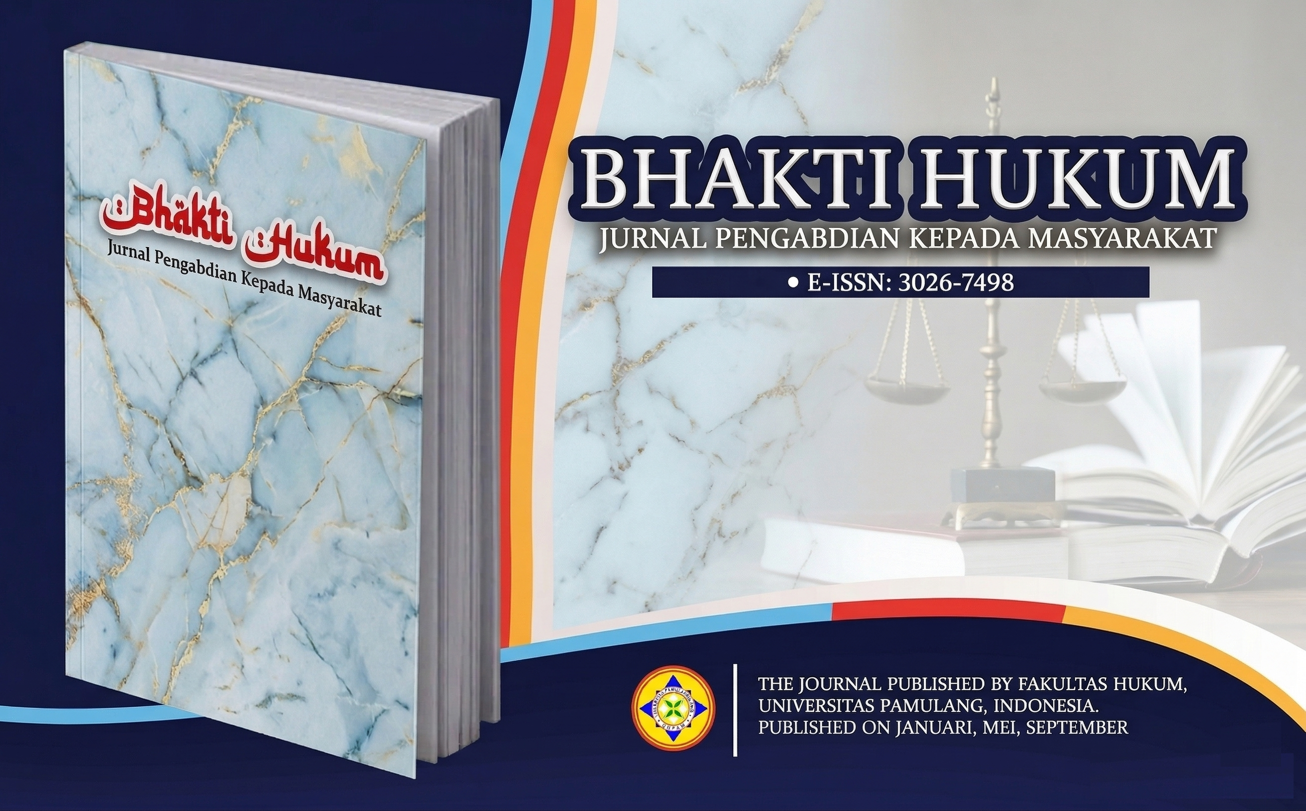 BHAKTI HUKUM: Jurnal Pengabdian Kepada Masyarakat merupakan jurnal ilmiah yang dikelola oleh Fakultas Hukum Universitas Pamulang dan mempublikasikan artikel hasil kegiatan Pengabdian kepada Masyarakat di bidang hukum. Jurnal ini bertujuan untuk mendiseminasikan penerapan ilmu hukum dalam rangka meningkatkan kesadaran hukum serta pemberdayaan masyarakat.